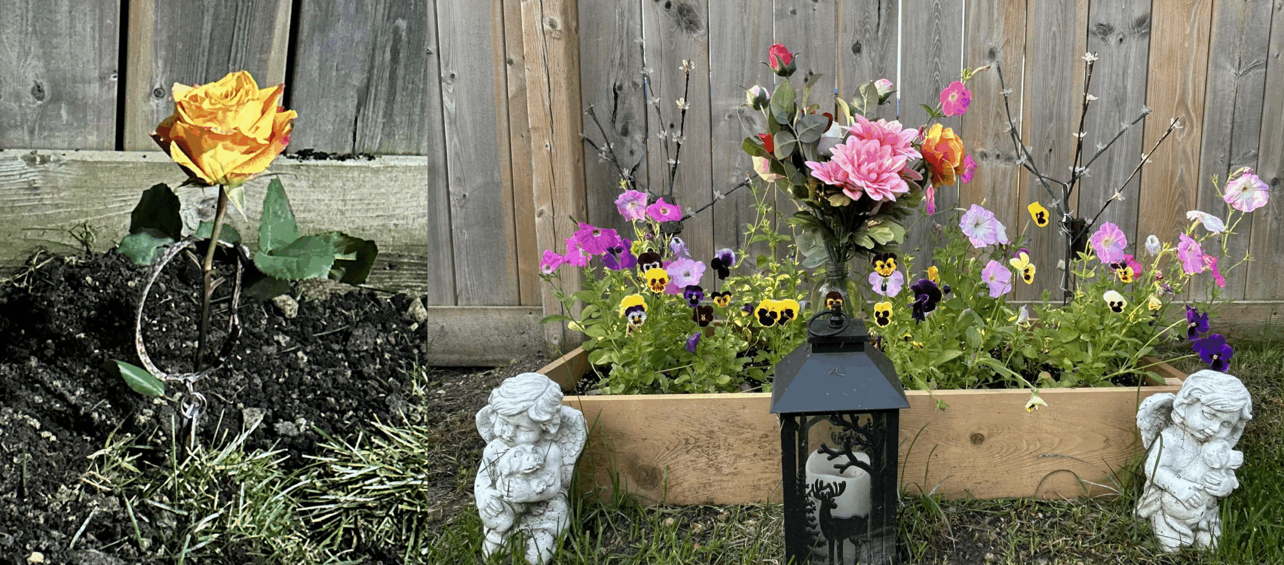The plot of earth that you’ve rested in for the past year has grown from the single meagre rose stuck in the dirt that encased your body now a full flower box adorned with flowers and small statues in your memory. I think my mother did a wonderful job creating the memorial.