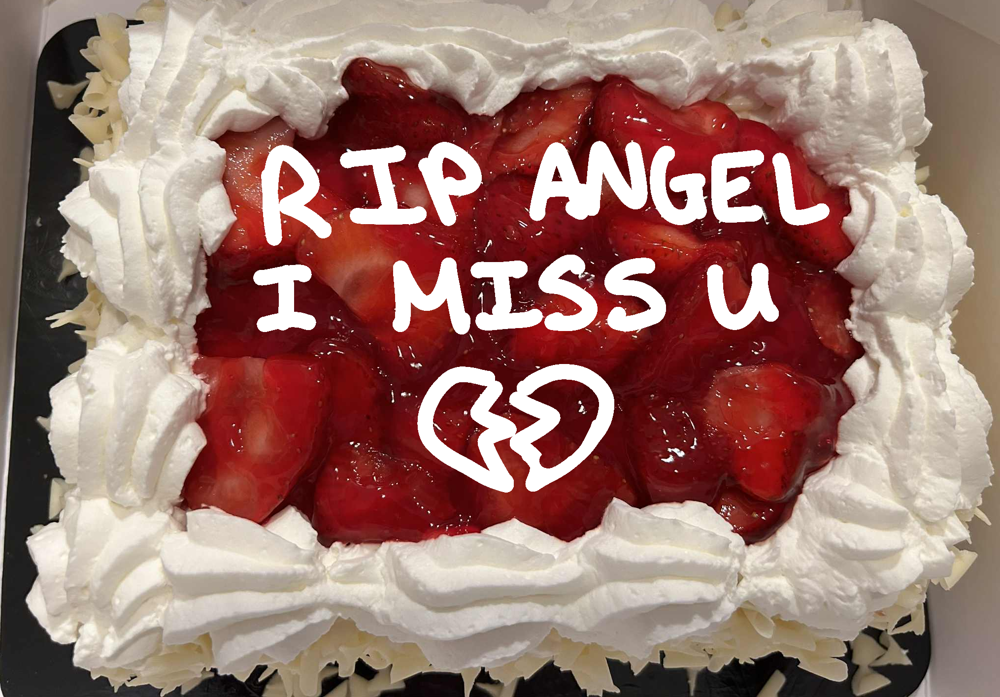 Today we got a cake for you. We were at the country side driving to a farm that sold eggs, and I’m not quite sure what led to the conclusion we should get a cake after that (we never got our eggs in the end either, a large truck was parked in the farm lot and a notice in 3 different languages was pinned to the door saying “NOT SELLING EGGS TODAY” and gee I wonder why.. certainly couldn’t be the comically long truck right beside the farm office) but I wont exactly complain since it is a delicious cake that we always purchase from our local grocery store. I deem it the “every celebration” cake, a simple strawberry shortcake with a strawberry preserve topping with shredded white chocolate decorating the edges of the cake. I’d even say it looks like you.. ignoring the gruesome imagery that the strawberry topping would bring, rather the furls of the shredded chocolate was very reminiscent of your curls.